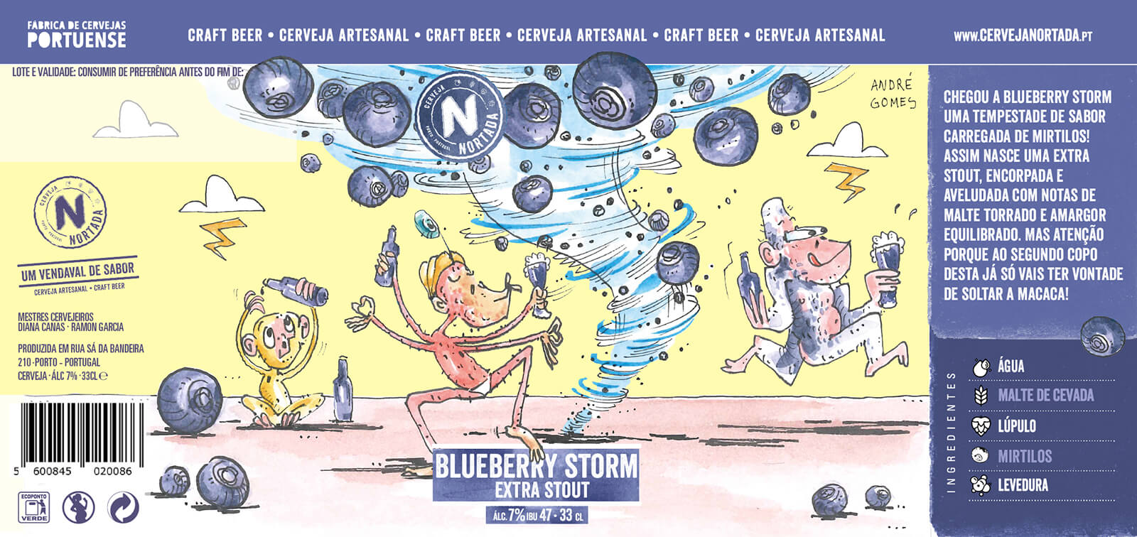 O meu objetivo era descobrir quais os elementos gráficos que funcionariam para representar o perfil da cerveja e adicionar elementos peculiares e engraçados que caracterizam a marca Nortada. Inspirei-me no nome “Tempestade de Mirtilo” e pensei que desenhar macacos a beber cerveja e mirtilos a voar à volta de um tornado seriam perfeitos, como representação de uma verdadeira tempestade de sabores. Porquê macacos? Achei que era engraçado!