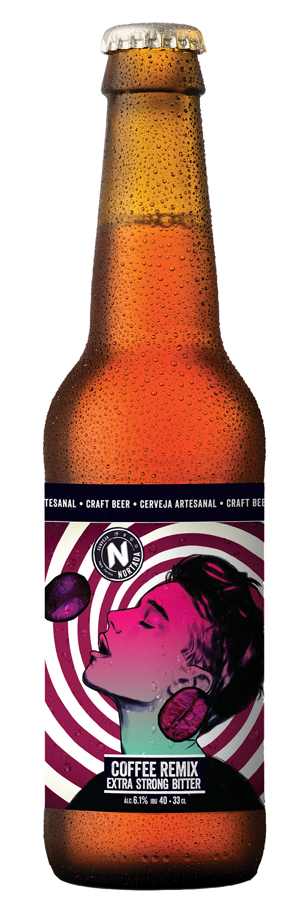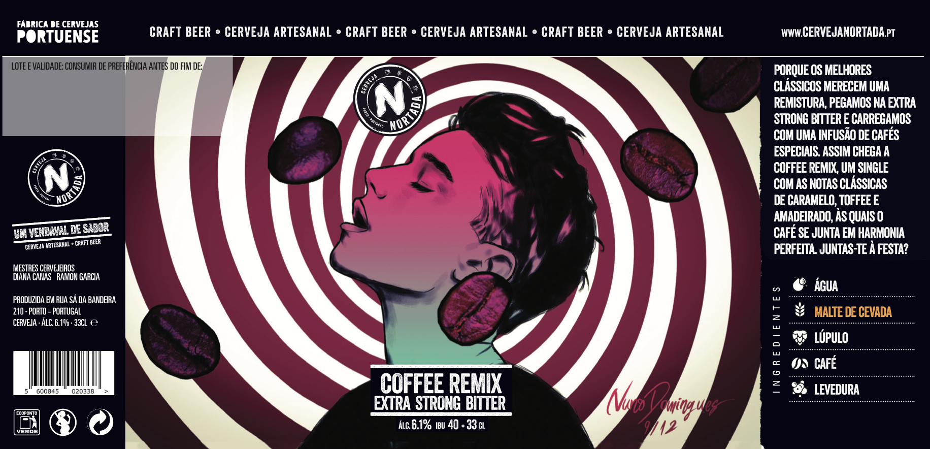 “O meu agradecimento à Cerveja Nortada por esta incrível oportunidade que me foi proposta! Este projeto foi uma novidade para mim, então tentei dar o máximo de vida à minha visão de uma cerveja completamente inovadora, que quebra com o expectável. A Coffee Remix é diferente, com um toque de café, e foi mesmo isso que tentei transmitir com o design que desenvolvi!”