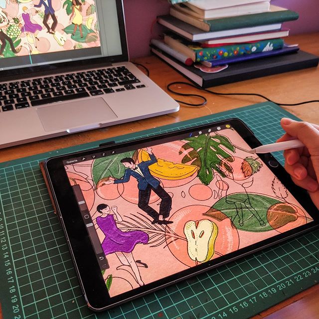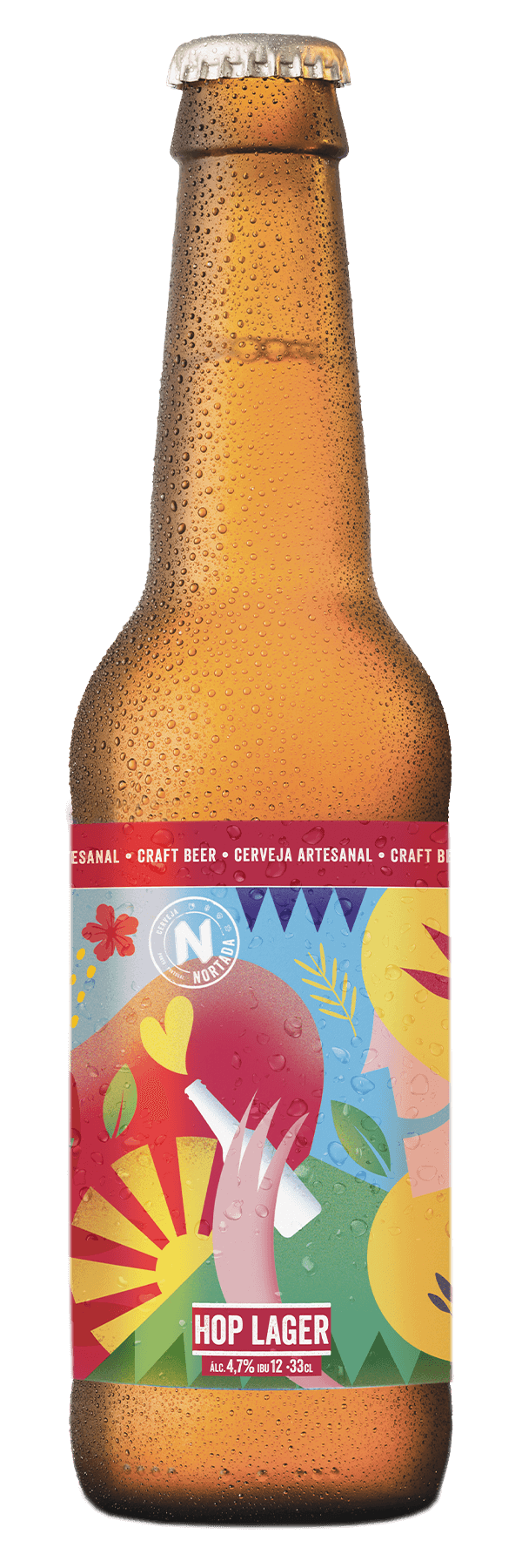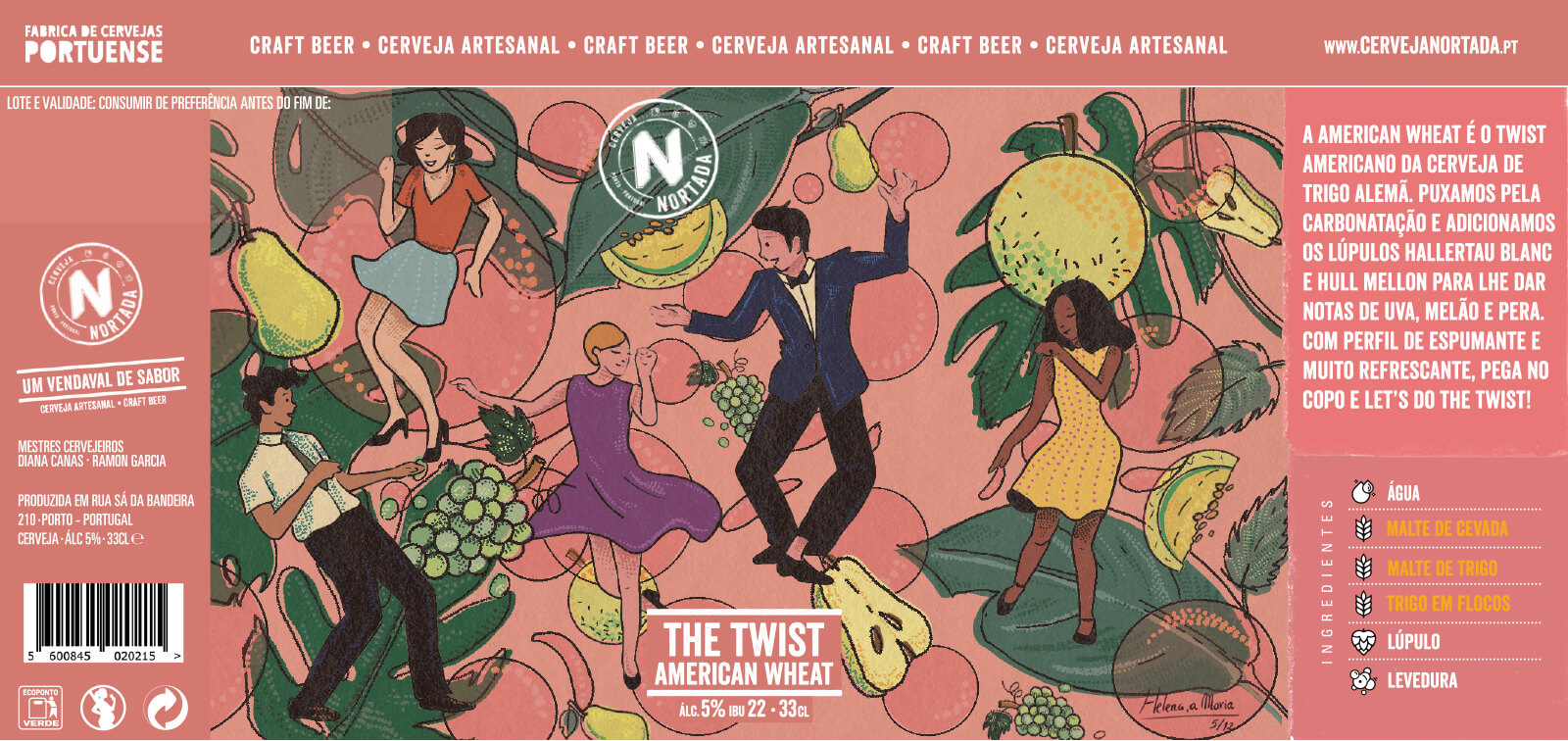 Quando recebi a proposta para trabalhar com a Nortada, fiquei super entusiasmada! Como o nome indica, “The Twist”, uma dança popularizada no fim da década de 50, levou-me a criar um rótulo retro mas também moderno. Sendo uma cerveja leve e refrescante, comecei por criar uma composição com folhas para dar a sensação de movimento e de frescura. Para representar as notas de melão, pera e uva, incluí-as na imagem juntamente com as bolhas a flutuar. As figuras principais representam o público que vai pegar na cerveja com vontade de dançar o Twist!